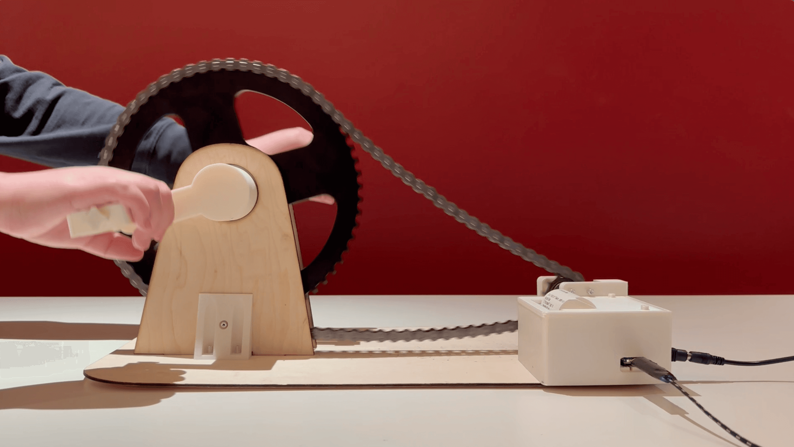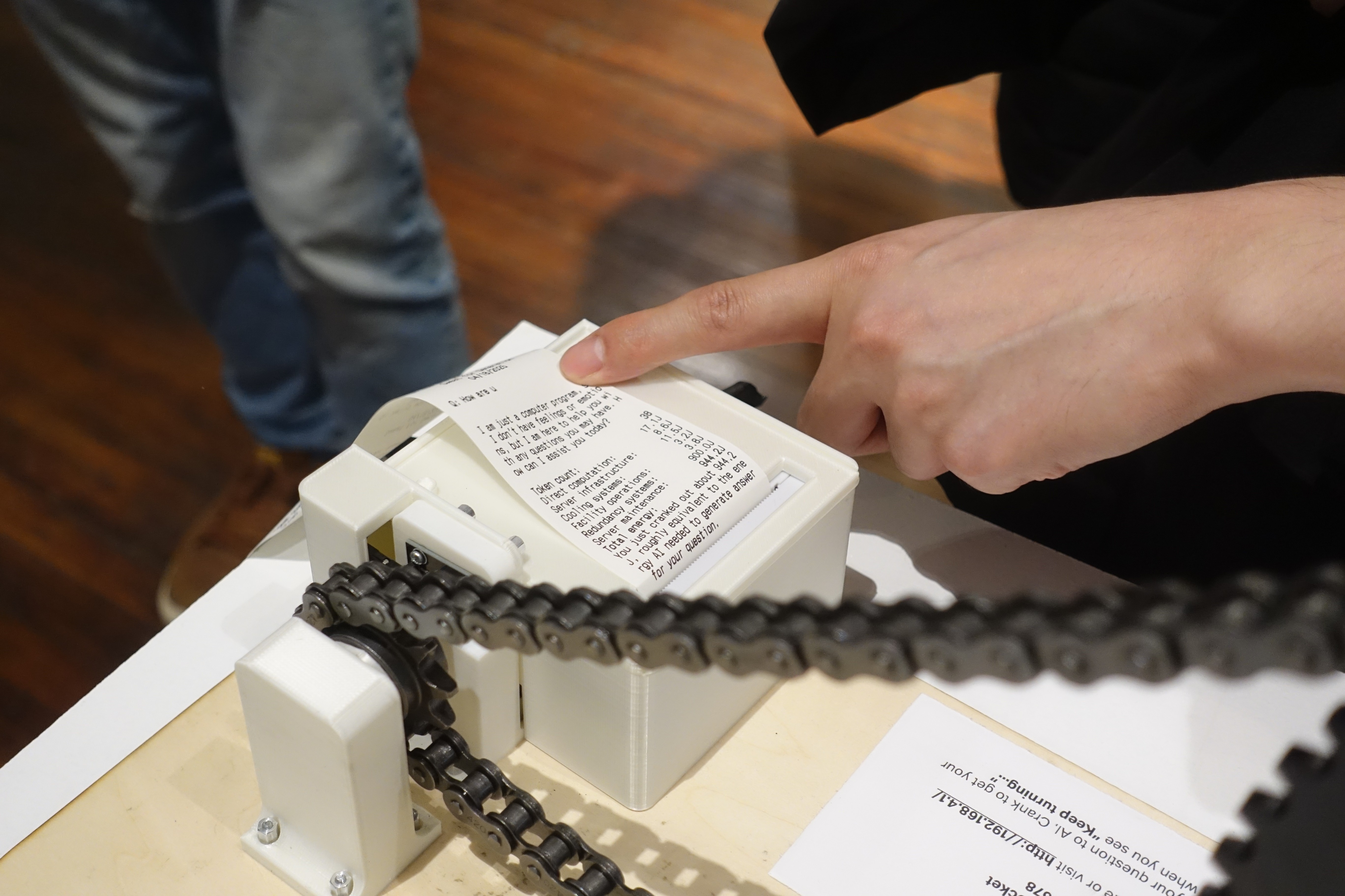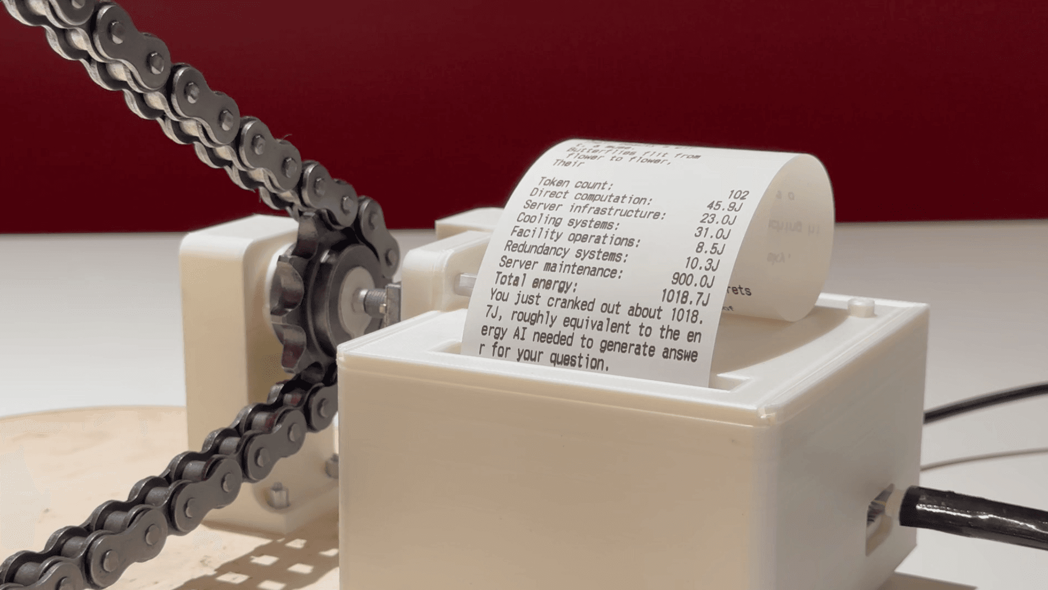 Participants are invited to submit prompts via a web page, but there is a catch: to see the AI's response printed, they must perform an equivalent amount of physical labor by turning the paddle. Once the AI's response is fully printed, the device reveals the token count and the exact energy consumed to generate that specific response.